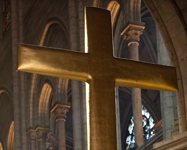 The Cross of Glory is a wooden cross gilded in yellow gold and Glory gilded in white gold. It is the work of Marc Couturier. The Cross was installed in Notre-Dame's choir in 1993 and the Glory in 1997. This Cross and Glory were commissioned by Cardinal Lustiger, archbishop of Paris (1981-2005). His idea was to make the tourists aware of the Christianity of the place as soon as they entered the cathedral.