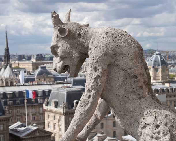 The grotesques, the stone statues which adorn the upper gallery between Notre-Dame's two towers, were designed by Eugène Viollet-le-Duc in the 19th century. They recreate the fantastic universe of the Middle Ages. Unlike the gargoyles which have a function of draining of rainwater, the grotesques serve only a decorative function.