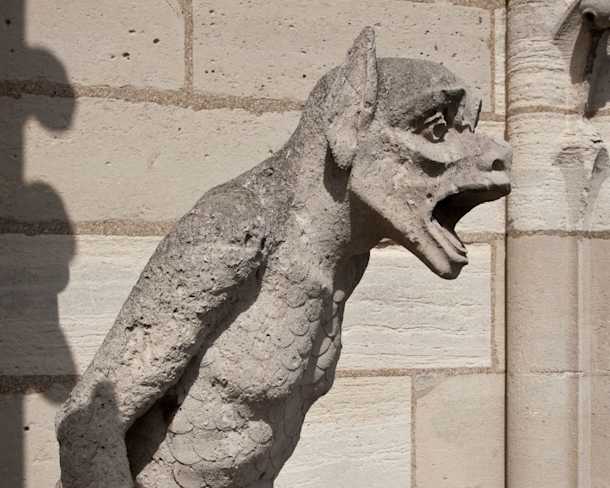 The grotesques, the stone statues which adorn the upper gallery between Notre-Dame's two towers, were designed by Eugène Viollet-le-Duc in the 19th century. They recreate the fantastic universe of the Middle Ages. Unlike the gargoyles which have a function of draining of rainwater, the grotesques serve only a decorative function.