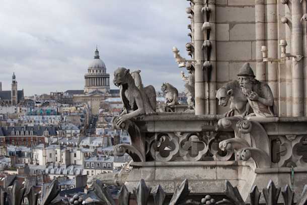 "The grotesques, the stone statues which adorn the upper gallery between Notre-Dame's two towers, were designed by Eugène Viollet-le-Duc in the 19th century. They recreate the fantastic universe of the Middle Ages. Unlike the gargoyles which have a function of draining of rainwater, the grotesques serve only a decorative function. Sculpted by the workshops of the artist Geoffroy-Dechaume, there are 54 grotesques.