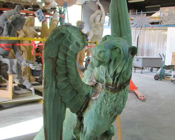 The Evangelist Saint Mark is represented in the form of a winged lion. He holds a closed book, representing the gospel of which he is the author. Located on the north-west corner of the spire, this copper statue was designed by Eugene Viollet-le-Duc, sculpted by Adolphe Victor Geoffroy-Dechaume and produced by the Alteliers Monduit in 1861. Height : 6.5 ft Weight : about 165 lb