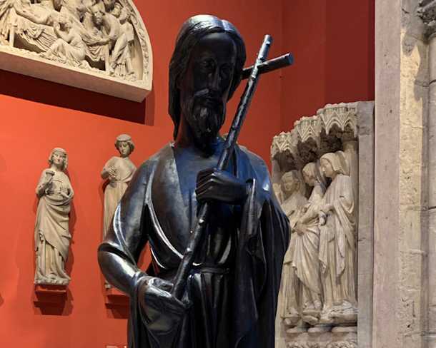 The representation of the Apostle Saint Philip holds in both hands a large Latin cross, the instrument of his martyrdom. Located on the south-west corner of the spire base, this copper statue was designed by Eugene Viollet-le-Duc, sculpted by Adolphe Victor Geoffroy-Dechaume and produced by the Alteliers Monduit in 1861. Height: about 3 ft Weight: about 330 lb