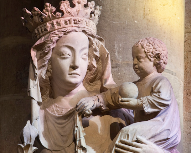 The statue of Notre-Dame de Paris, or the Virgin of the Pillar, is a stone statue that is the best known of the representations of the Virgin of the cathedral. Sculpted in the middle of the 14th century, it comes from the Saint-Aignan chapel located in the former Cloister of the Canons on the Île de la Cité. Transferred to Notre-Dame in 1818, it was first placed in the overmantel of the Portal of the Virgin to replace the the 13th century Virgin, which was destroyed in 1793.